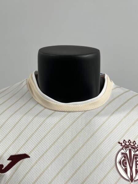 La Camiseta Villarreal Segunda Equipación 2025-2026 destaca por su elegante tono blanco con finas líneas diagonales doradas y detalles en burdeos, ofreciendo un diseño moderno y sofisticado. Una prenda llamativa que combina identidad, estilo y orgullo groguet en cada detalle.
