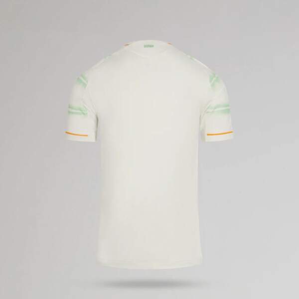 La Camiseta Celtic FC Tercera Equipación 2025-2026 luce un elegante blanco roto realzado con vivos detalles en verde y naranja brillante, que le otorgan un estilo llamativo y fresco.
