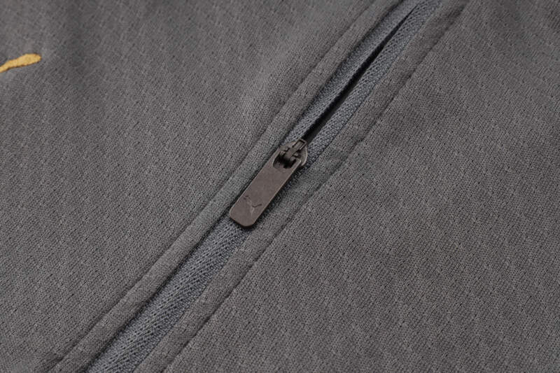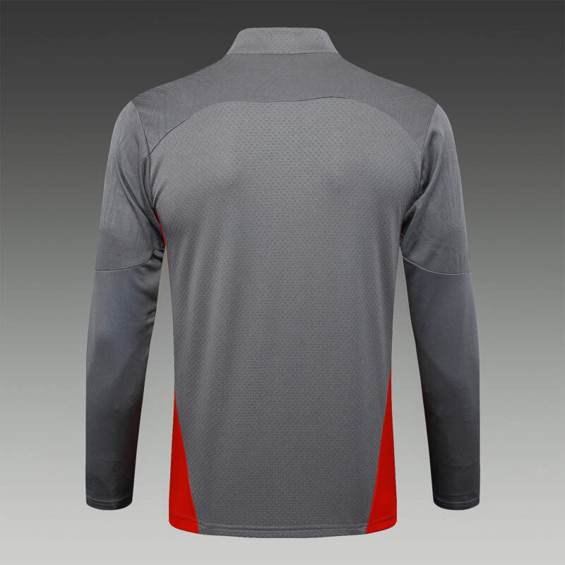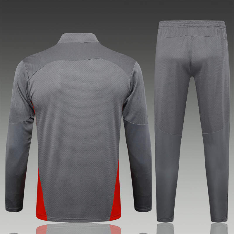 Este chándal resalta por su base en color gris elegante, realzado con detalles en dorado y rojo que le dan un aire sofisticado y distintivo. La chaqueta incluye cierre completo, cuello alto y un corte entallado, ideal para lucir estilo dentro y fuera del campo. 💼⚽ -