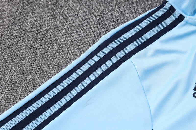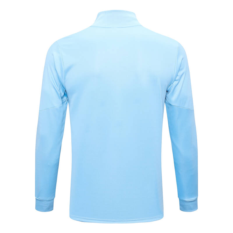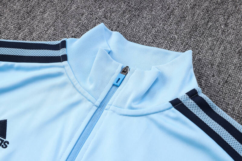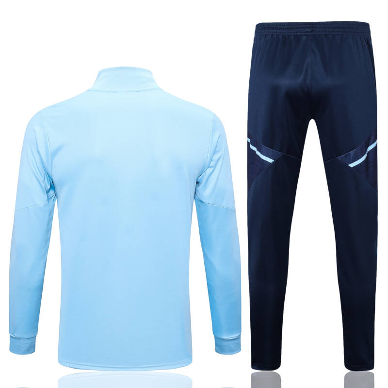 Fabricado de poliéster, la chaqueta presenta corte entallado que se ajusta al tronco y los brazos, cierra con una cremallera frontal, las mangas largas son con puño de canalé. El pantalón se sujeta con elástico en la cintura, cuenta con bolsillos ocultos en los laterales. Además, presenta el icónico logo de la marca y el escudo del club bordado.
