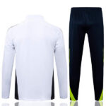 La chaqueta blanca con paneles negros y vivos en verde neón ofrece un diseño moderno y técnico, con el escudo bordado del club y el logo en el pecho. Las tres franjas negras en las mangas refuerzan la identidad deportiva.