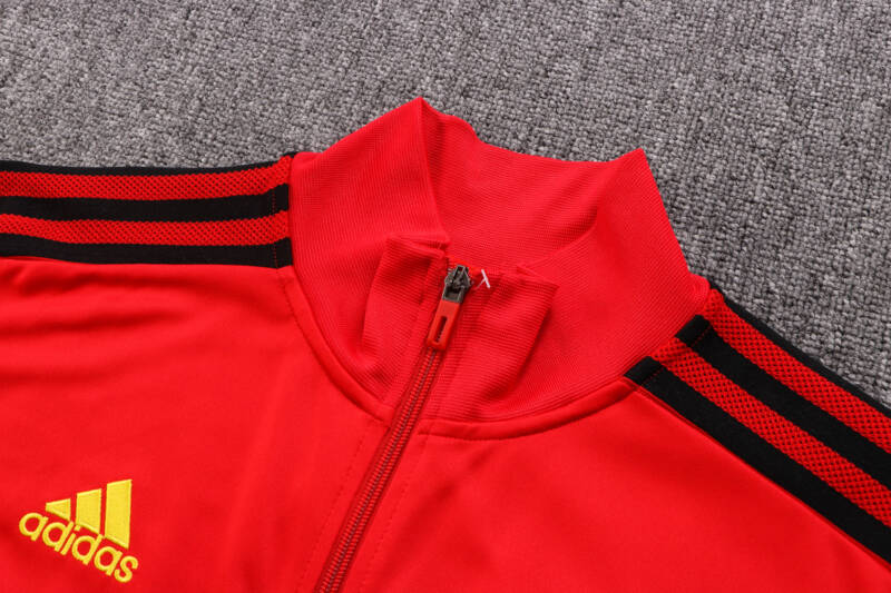 Fabricado de poliéster, la chaqueta presenta corte entallado que se ajusta al tronco y los brazos, cierra con una cremallera frontal, las mangas largas son con puño de canalé; el pantalón se sujeta con elástico en la cintura, cuenta con bolsillos ocultos en los laterales. Además, presenta el icónico logo de la marca y el escudo del club bordado en ambas piezas.