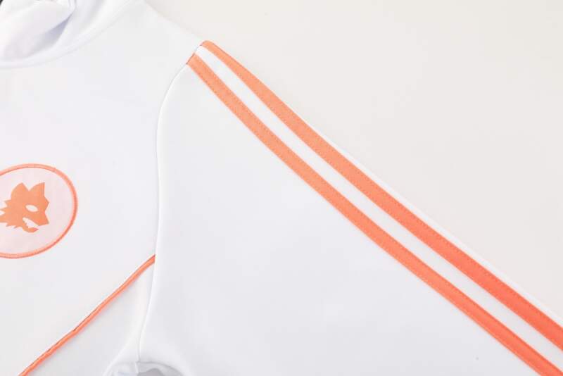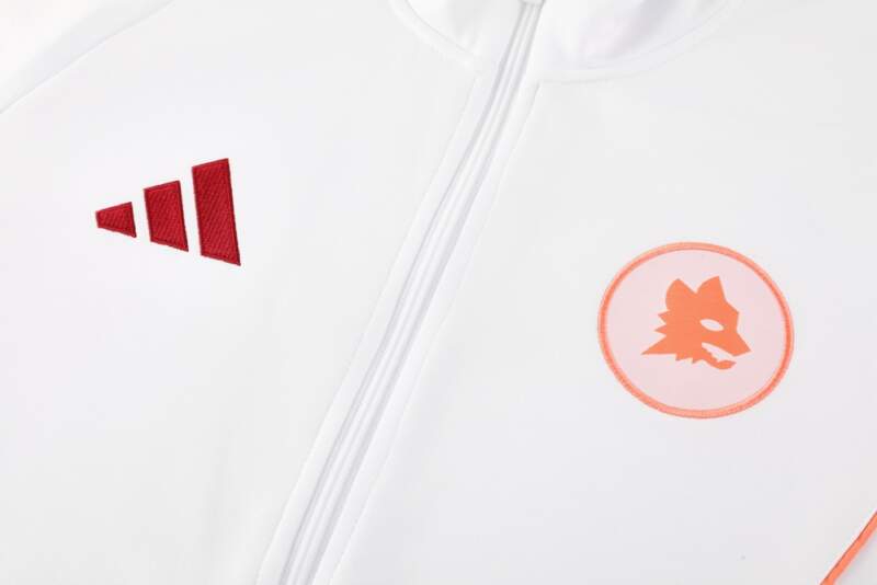 El Chándal AS Roma 2024-2025 es una prenda imprescindible para los verdaderos fanáticos del club romano. Su diseño exclusivo combina una chaqueta blanca con detalles en naranja claro y un pantalón rojo, creando un equilibrio perfecto entre elegancia y espíritu deportivo. Ideal tanto para entrenamientos como para lucir un look casual con el orgullo giallorosso. chandal-roma-blanco-2024-2025-pretina chandal-roma-blanco-2024-2025-dorsal chandal-roma-blanco-2024-2025-pecho