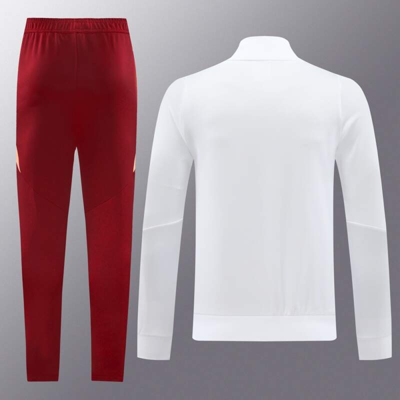 Este chándal destaca por su chaqueta blanca con detalles en naranja claro y pantalón rojo, un diseño moderno y elegante que refleja el orgullo giallorosso.