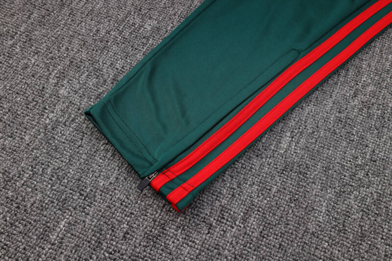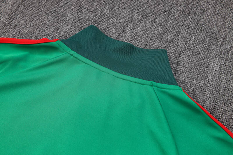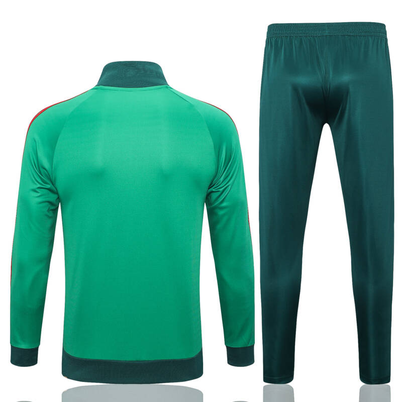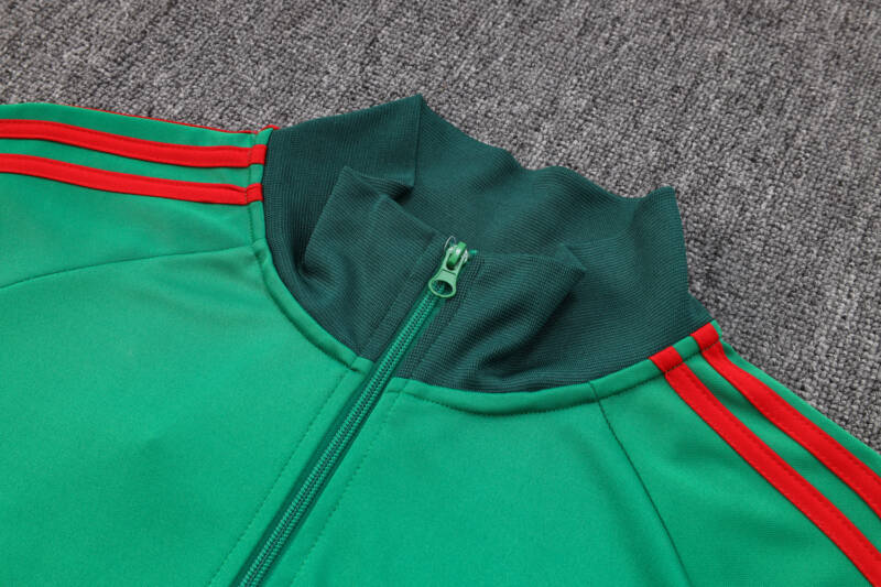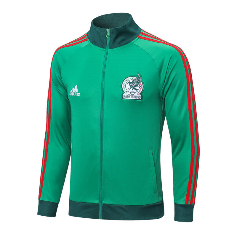 Fabricado con poliéster; la chaqueta presenta corte entallado que se ajusta al tronco y los brazos, cierra con una cremallera frontal, las mangas largas son con puño de canalé; el pantalón se sujeta con elástico en la cintura, bolsillos laterales y cremalleras en los puños. Además, presenta el logo de la marca y el escudo de la Federación Mexicana, este chándal es ideal para llegar a la cancha y lucirte manteniendo los colores de este hermoso país.