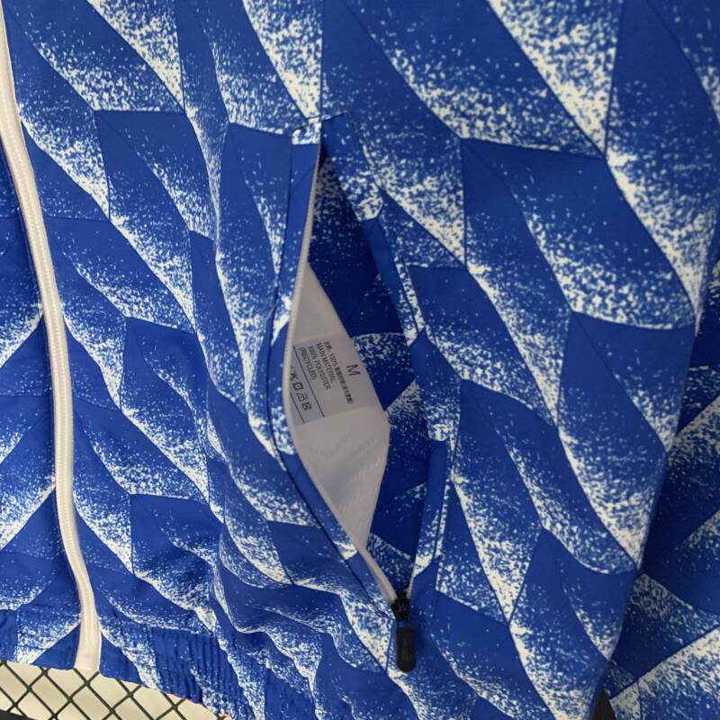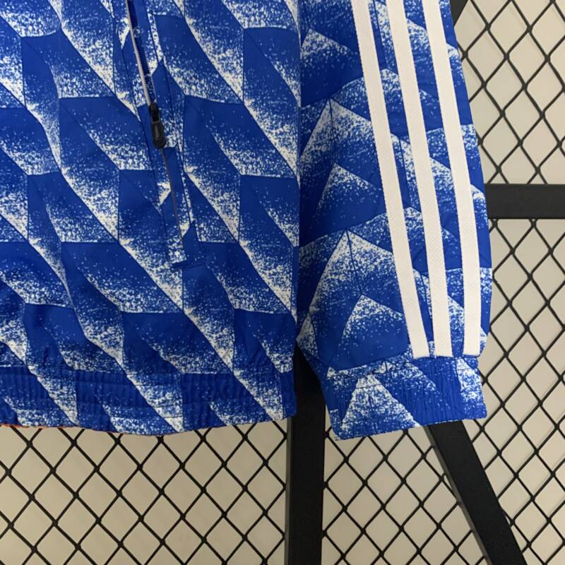 Sumérgete en el estilo dual de la chaqueta reversible de Países Bajos 2023: azul para la serenidad, naranja para la pasión. Con relieves blancos que añaden un toque de distinción, esta prenda te lleva de la calma a la energía con un giro. ¡Una elección audaz para los que desafían los límites de la moda!