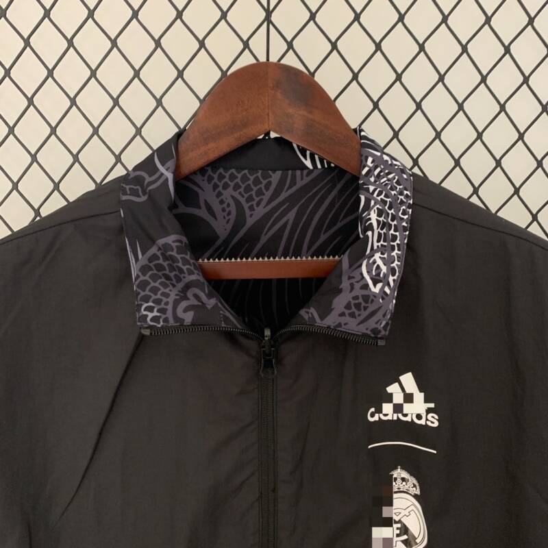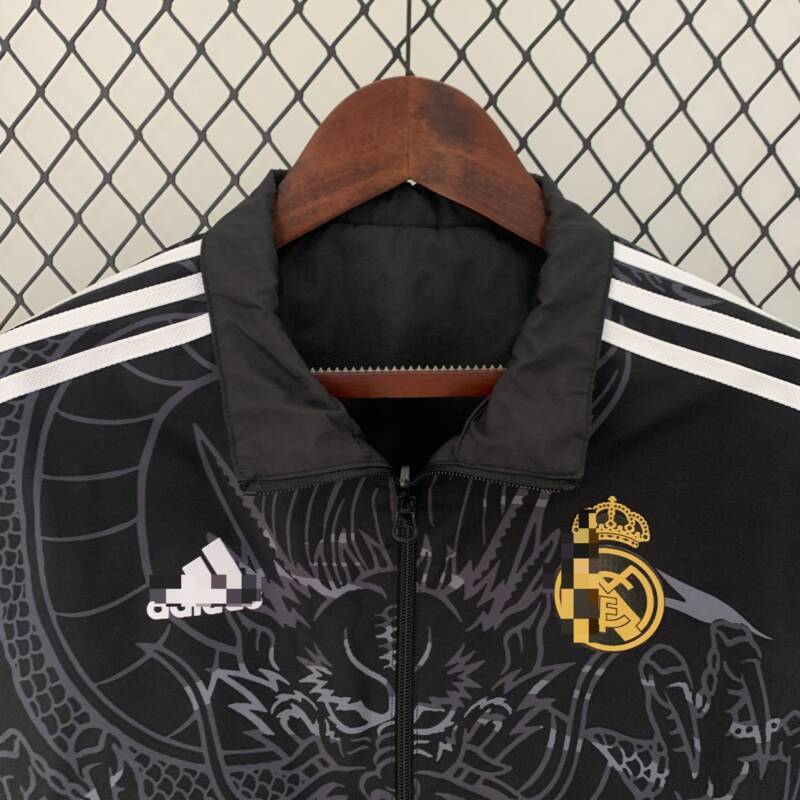 La chaqueta reversible del Real Madrid es un homenaje a la grandeza y el legado del club. El negro clásico representa la elegancia y la tradición, mientras que el dragón blanco simboliza la fuerza y el espíritu indomable del equipo en el campo de juego. Esta representación del dragón, inspirada en la mitología y la cultura, añade un toque de originalidad y poder a la chaqueta. Al llevar esta chaqueta, llevas contigo la historia y la pasión del Real Madrid, haciendo una declaración de estilo que resonará entre los aficionados de todo el mundo.