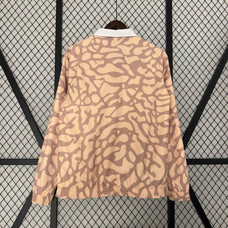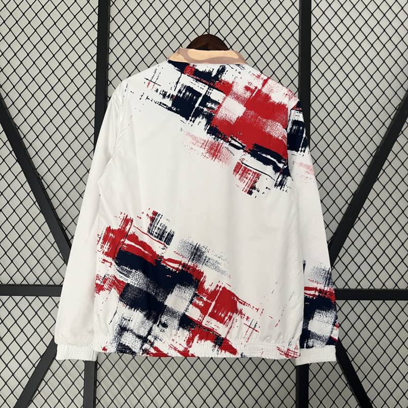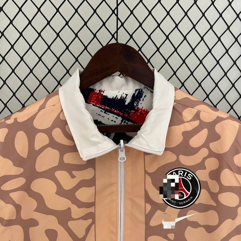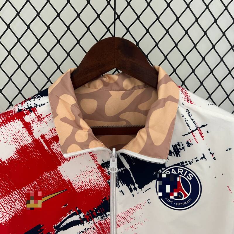 Inspirada en la energía y el prestigio del Paris Saint-Germain, esta chaqueta reversible captura la esencia del club con su diseño único y sus colores emblemáticos. El blanco y negro representan la elegancia clásica del equipo, mientras que el rojo simboliza la pasión y el dinamismo en el campo. Además, el otro modelo, con tonos de melón y marrón inspirados añade un toque de originalidad y estilo a esta prenda icónica.
