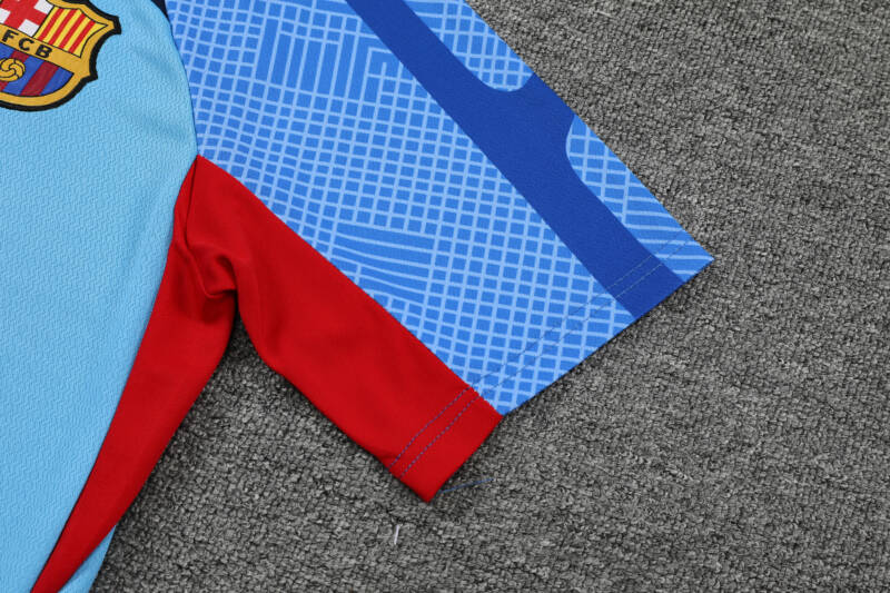 Conjunto de entrenamiento manga corta del FC Barcelona  rojo y azul temporada 2022/2023, con diseño en un corte entallado en la camiseta y corte clásico en el pantalón corto, diseñado con tecnología de secado rápido que permite eliminar más rápido la transpiración durante los ejercicios.