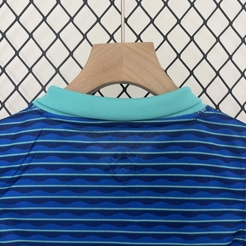 1. Camiseta espectacular: Con un vibrante color azul 🌊 y patrones inspirados en la rica cultura brasileña 🎨, esta prenda brilla con detalles en amarillo 💛 en el cuello y los puños. El escudo bordado 🛡️ en el pecho le da un toque auténtico y de calidad.