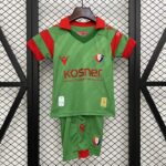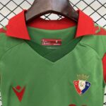 El Conjunto Niño CA Osasuna Segunda Equipación 2025-2026 luce un vibrante color verde con detalles en rojo, ofreciendo un diseño fresco y lleno de energía para los pequeños aficionados.