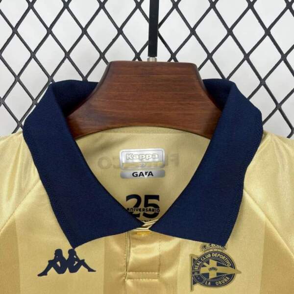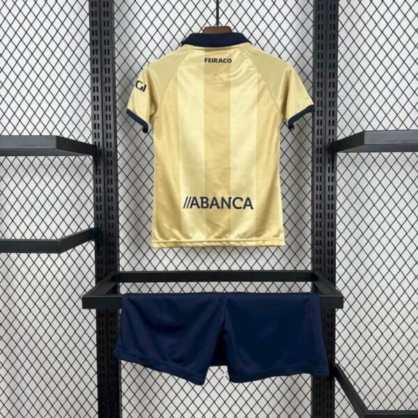 El Conjunto Niño Deportivo de La Coruña 25 Aniversario 2025-2026 combina camiseta dorada con detalles azul marino y pantalón a juego, ofreciendo un diseño elegante y conmemorativo.