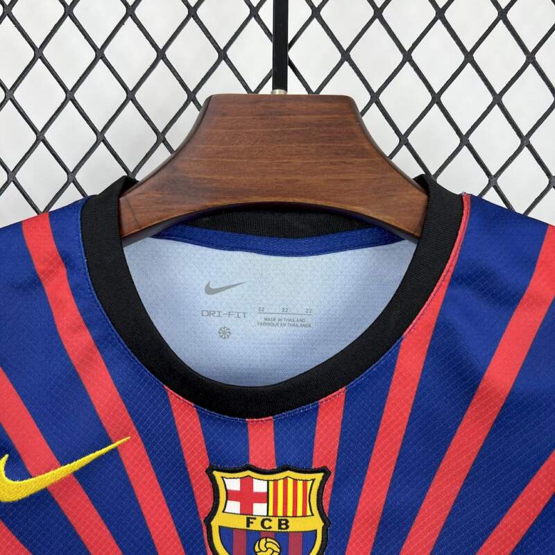 🟡 Escudo del Barça en una pierna y el swoosh de la marca en amarillo en la otra, manteniendo el equilibrio entre identidad y diseño deportivo.