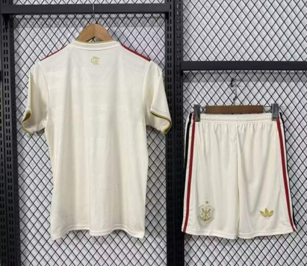 El Conjunto Niño Flamengo Tercera Equipación 2025-2026 luce un elegante diseño en blanco con detalles en dorado, ofreciendo un estilo distinguido y cómodo para los más jóvenes aficionados del Mengão.