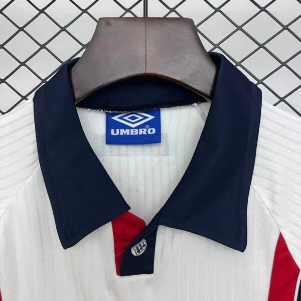 4. Detalles Retro: Escudo de Inglaterra y logotipos en estilo clásico que evocan la esencia futbolística de los 90.