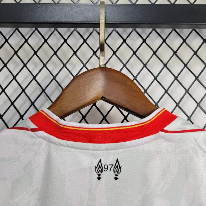 - La camiseta luce un diseño elegante en blanco con toques en rojo que reflejan el estilo clásico de Liverpool y destacan el escudo del equipo con orgullo. 🏅