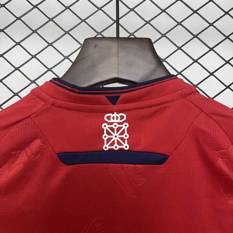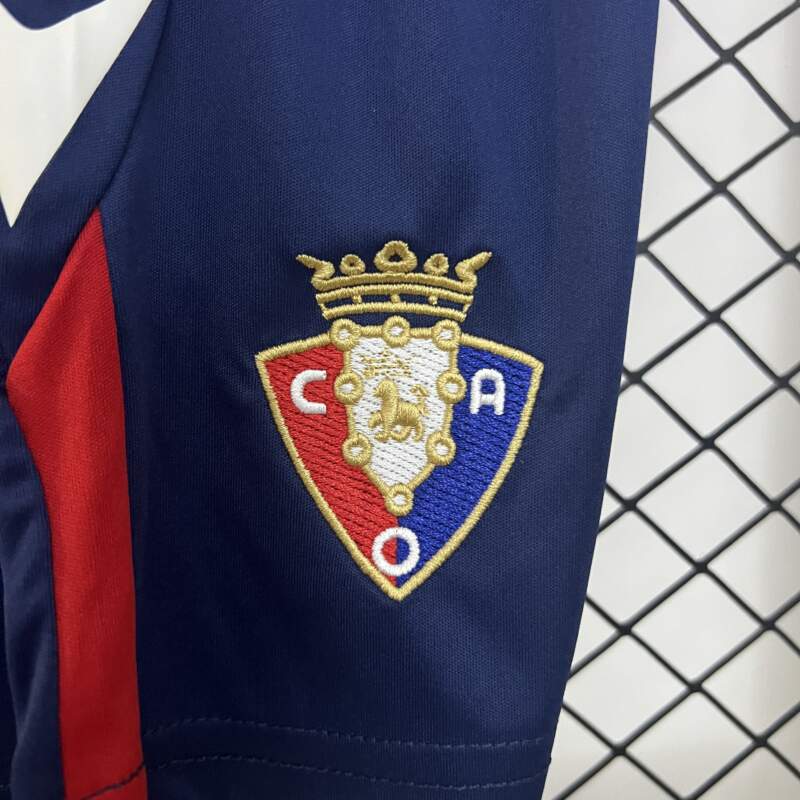 3. Detalles únicos 🔥: El escudo del club se encuentra bordado en el pecho, simbolizando el vínculo con la historia y los valores de Osasuna. Además, el pantalón corto en azul marino complementa perfectamente el diseño de la camiseta, creando un look completo.
