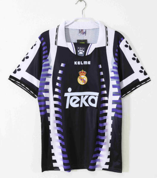 La segunda equipación del Real Madrid en 1997-1998 se convirtió en un símbolo de los diseños más atrevidos de los años 90. Con una base en negro y un patrón geométrico en morado y blanco, esta camiseta de Kelme rompió esquemas y quedó grabada en la memoria de los aficionados.🏃♂️🔥