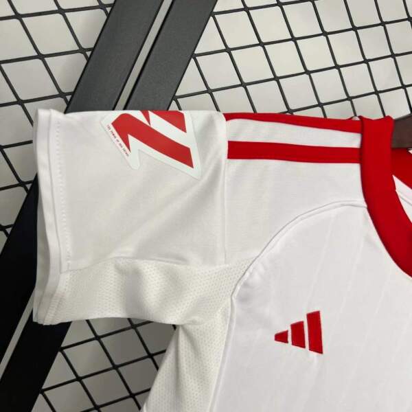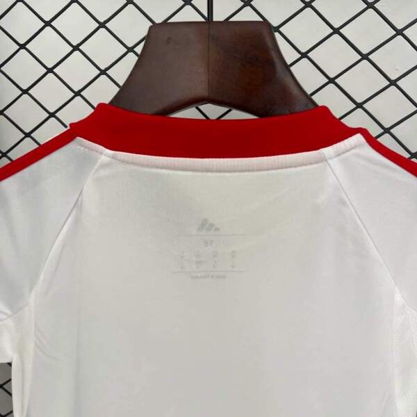 1. Diseño Clásico: Predomina el blanco puro en camiseta y pantalón, con detalles en rojo intenso en cuello, hombros y laterales, que resaltan la identidad del Sevilla FC.