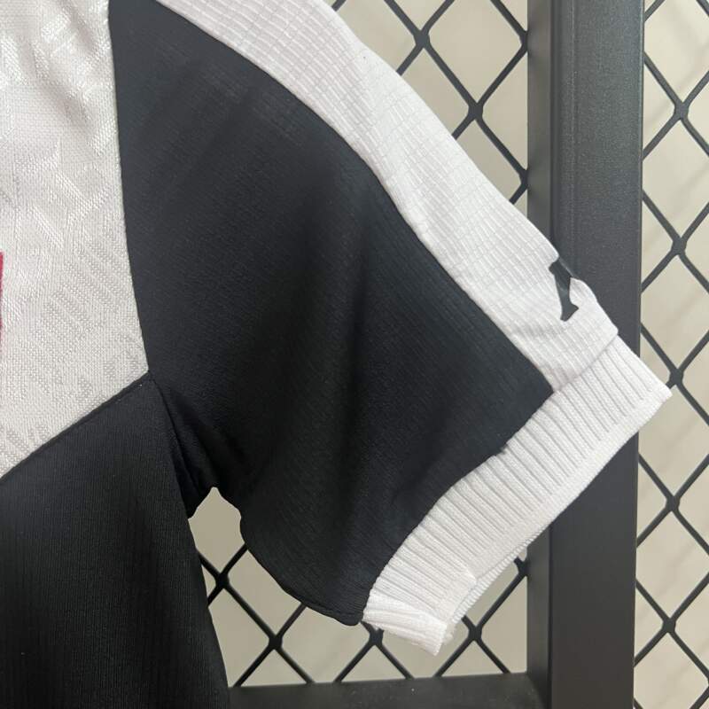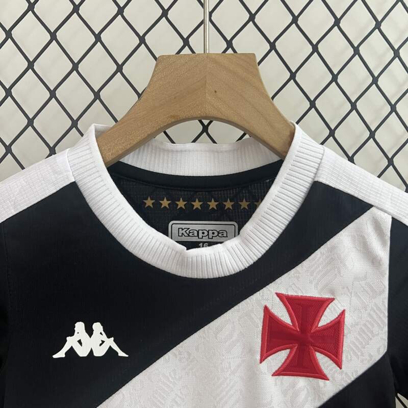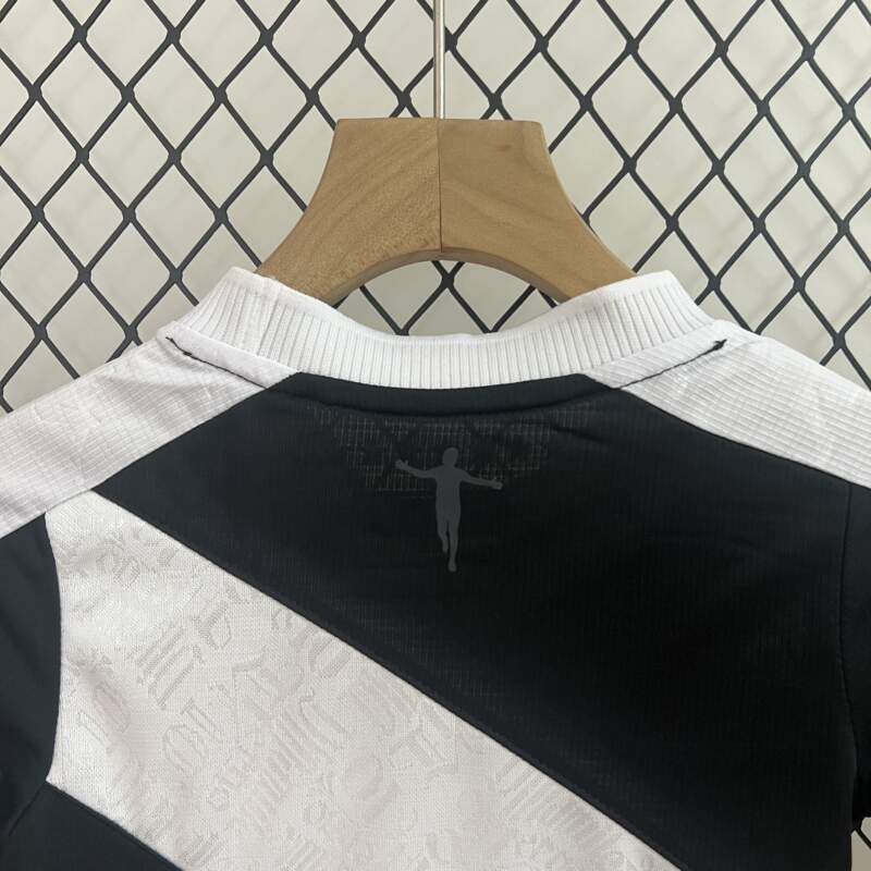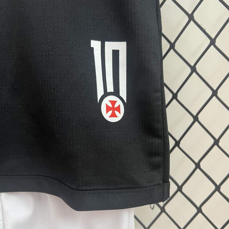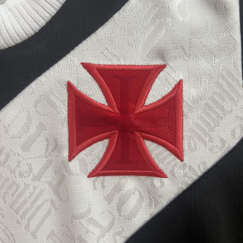 Diseño tradicional y emblemático 🎨 – Predomina el color negro con la clásica franja diagonal blanca, acompañado del escudo del Vasco da Gama en el pecho, reflejando la historia y grandeza del club.